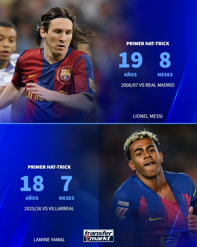 3月3日讯 德国转会市场盘点了部分球星首次戴帽的年龄,姆巴佩17岁,亚马尔18岁,梅西19岁。