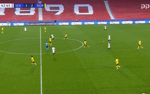 43'塞维利亚中场传球失误,罗伊斯带球推进后分边,哈兰德单刀球梅开二度,多特3-1领先!