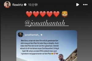 体育资讯6月23日讯 若纳坦-塔与维尔茨并肩效力勒沃库森多年,今夏两人分道扬镳。塔转会加盟拜仁,维尔茨远走英伦。塔在社交媒体致信告别维尔茨,维尔茨也在社媒上回复了塔。